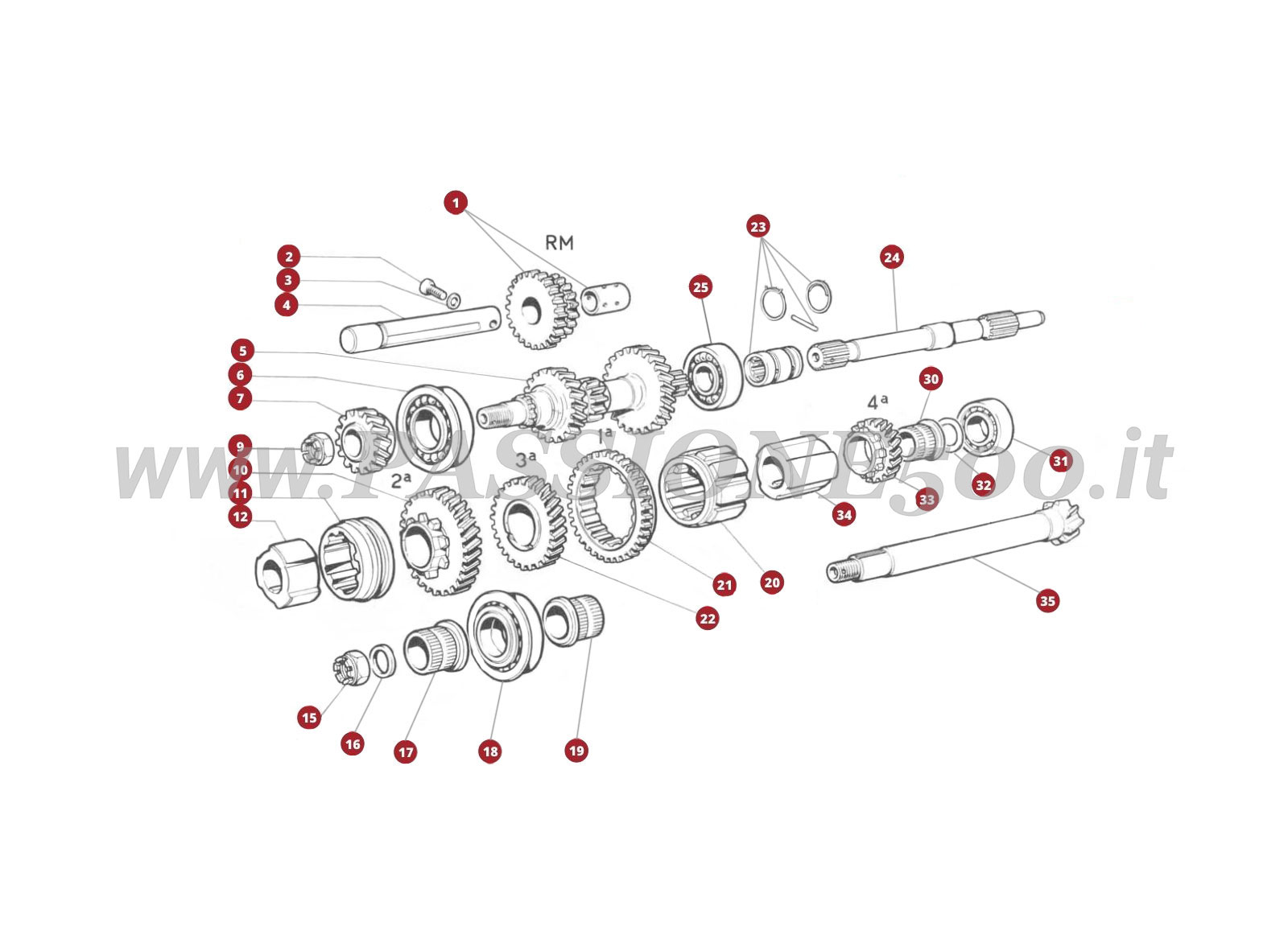 Home » Seleziona il metodo di ricerca » Fiat 500 » Fiat 500 F » Schemi Esplosi Tecnici di Meccanica F » ESPLOSO 18M – Ingranaggi e componenti cambio FIAT 500F